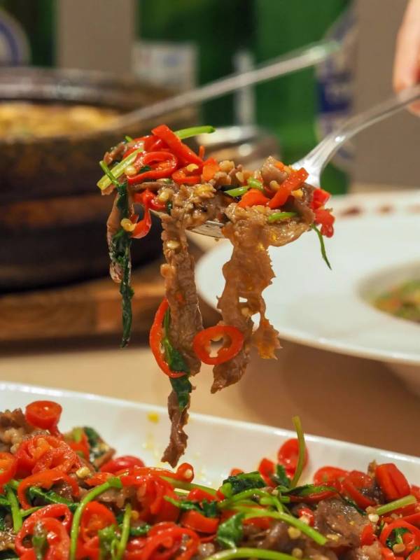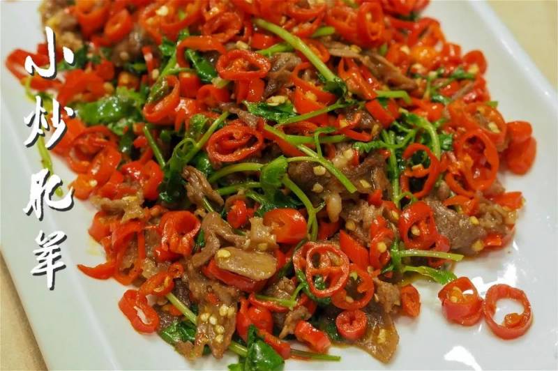 这道红通通的小炒肥羊,一推出就受到了很多蜀宴老顾客的喜爱。这道菜的原型是一道叫“小炒黑山羊”的菜肴。鲜红的辣椒圈、绿色香菜和嫩滑的羊肉完美的搭在一起。