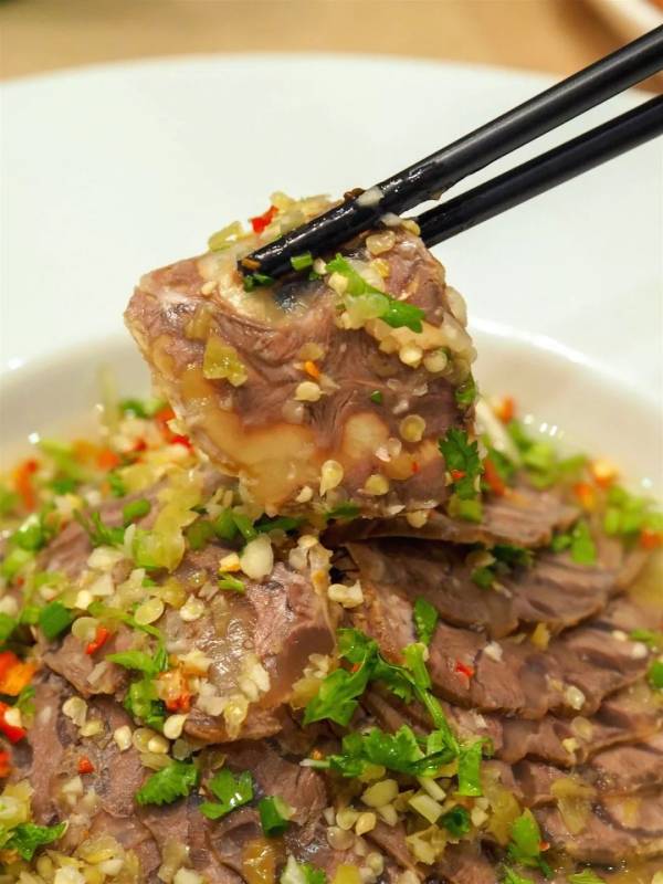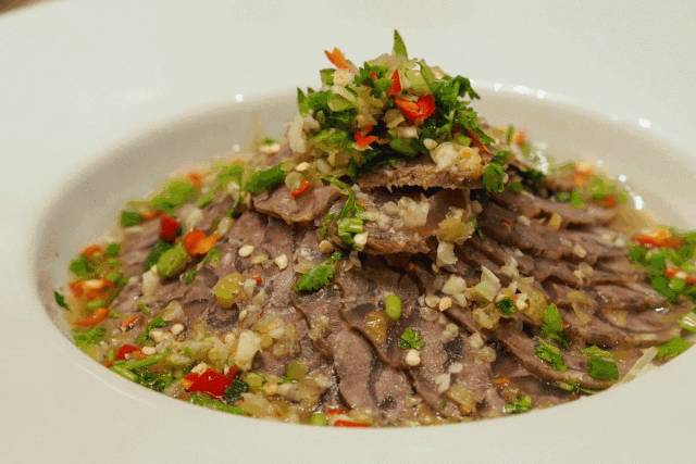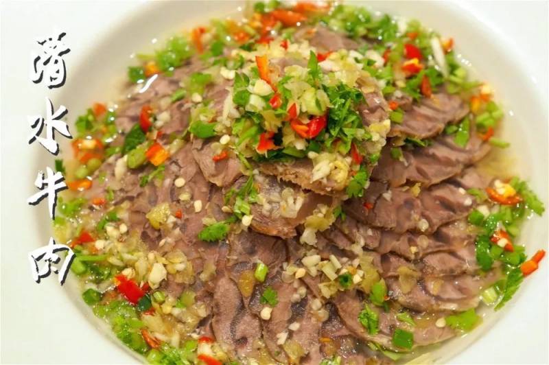 清水牛肉这道菜一上桌,就能闻到一股清香的青辣椒香气,还没吃就感觉特别的开胃。一片片牛腱子肉铺在白色的盘中,一层层堆叠起来感觉像展开的裙摆。