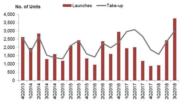 第三季度,开发商共计推出了3,754套尚未完工的私人住宅(不含执行共管公寓),在第二季度的2,437套的基础上有所增加。而第三季度成功售出3,012套私人住宅(不含EC),比第二季度(2,366)增加了646套。
