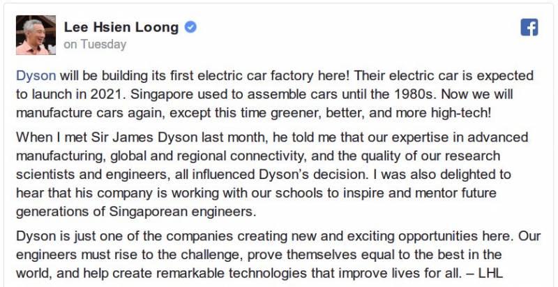 李显龙总理还专门在脸书(Facebook)上写了很长一段寄语,不仅表达了这是个靠谱双赢的决定,言语间也看得出他确实难掩激动之情!看来政府也是非常重视戴森这次选址新加坡的决定了。