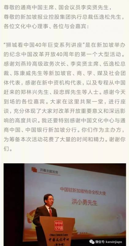 2018年10月24日,洪小勇大使出席“狮城看中国40年巨变系列讲座”开幕式并发表讲话,讲话全文如下: