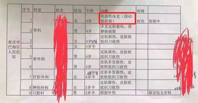 而医院流传出来的诊断单,更是让人看了心痛。孩子们均在3-4岁,大多是面部及颈动脉受伤,多名孩子“危重”!