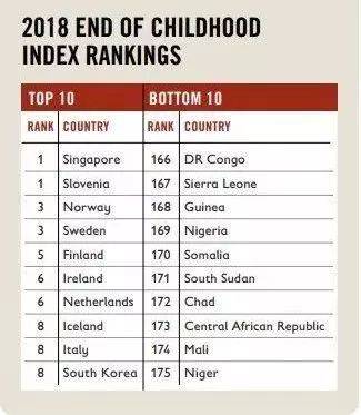 国际非政府组织“救助儿童会”(Save The Children)发布的《童年终结数据》中,新加坡获得了987分(满分1000分),远高于挪威等欧洲国家。表现优异的两方面是:早孕以及五岁以下儿童死亡率。