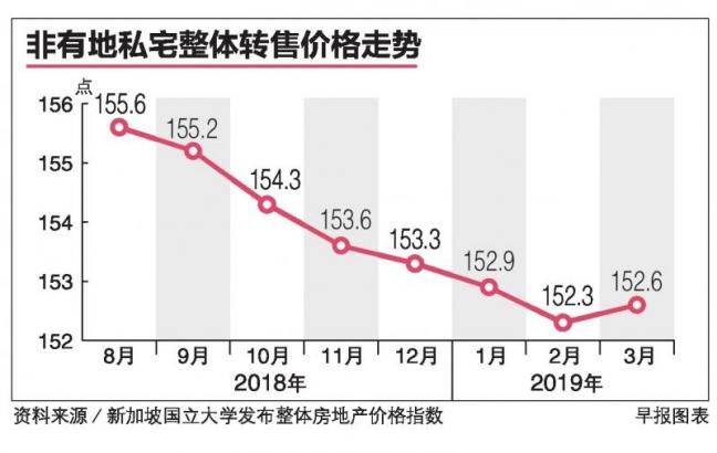 3月份的非有地私宅整体转售价格指数为152.6,环比起0.1%;2月则跌0.4%。