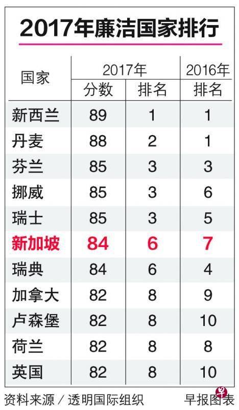 根据2017年透明国际(Transparency International)公布的廉洁指数报告,新加坡取得84分的成绩,与瑞典并肩为全球第六大最清廉的国家。
