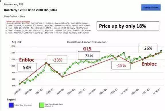 纵观这近15年来的房价,虽然中间有短期周期性波动,但总体还是呈现出上升的趋势,从2005年至2018年第二季度,新加坡房价整体已经翻了一番。