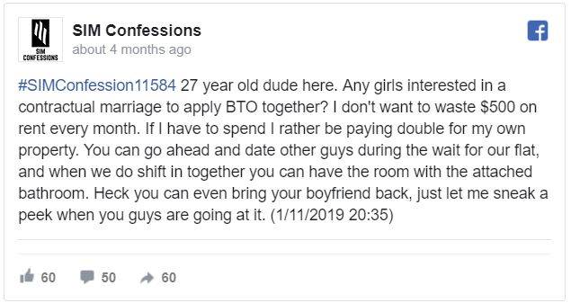 其大意为:“本人为27岁男性,寻找女生有兴趣进行合约婚姻,一起申请BTO。