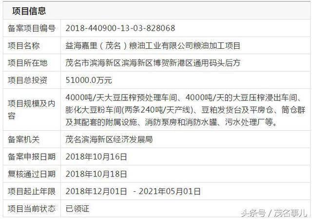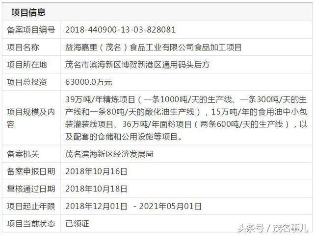 益海嘉里集团两大加工项目已正式落户茂名市滨海新区博贺新港区,总投资达11.4亿元,现已审批通过,正处于领证阶段。