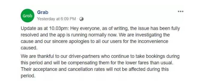 :嘿,大家好,我们已经将APP的故障维修好了。现在APP运行正常。我们正在调查故障原因。在此,我们为系统故障导致的生活不便,表示深深的歉意。我们非常感谢那些在APP崩溃期间,依旧接受订单的Grab司机。我们将补偿他们损失的费用。APP崩溃期间,他们的接单率和取消订单率将不会影响未来的评估。