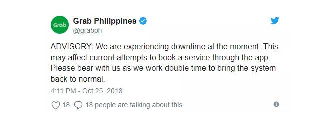 菲律宾Grab的推特账号,在当天下午4点po文称正在全力解决APP的故障...
