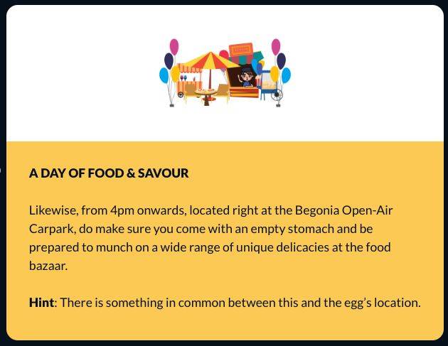 据说,各种美食高手将在Begonia Open-Air Carpark摆摊。更重要的是,这个地方与金蛋的所在地有关。