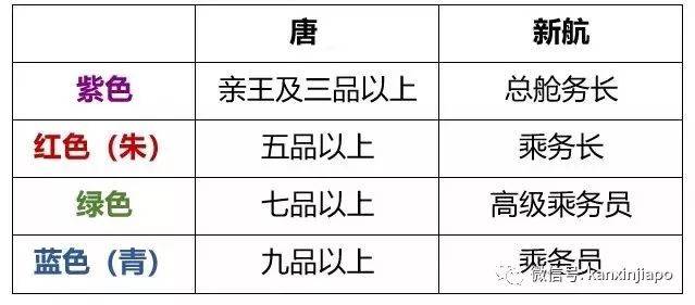蓝色代表乘务员,一般年资在1-5年;绿色是高级乘务员,需要工作到5年以上;红色为乘务长,要至少10年的工作经验;紫色是职位最高的总舱务长,属于空乘中的管理层。