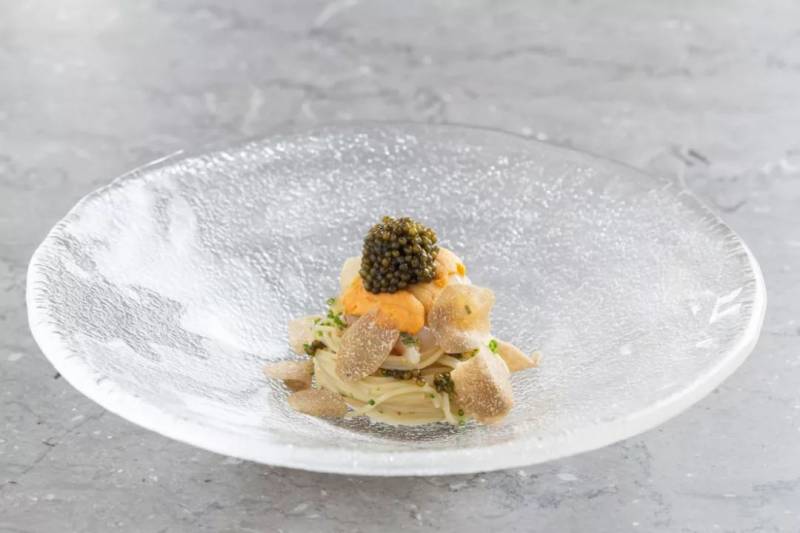 餐盘和器皿更是锦上添花,酒器是全套的Zalto,连水杯都是,这样的手笔很是难得。为了更好地服务客人,明明可以坐100多人,只接受一半的位置预定。每位侍者都喷同一品牌的香水,分量恰到好处,不会影响食客。