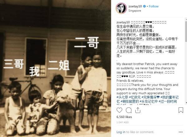 (新加坡28日讯)新传媒阿姐郑惠玉日前 (26日)在IG发文,指二哥Patrick突然离世,作妹妹的没机会道别,心中有千万的不舍……