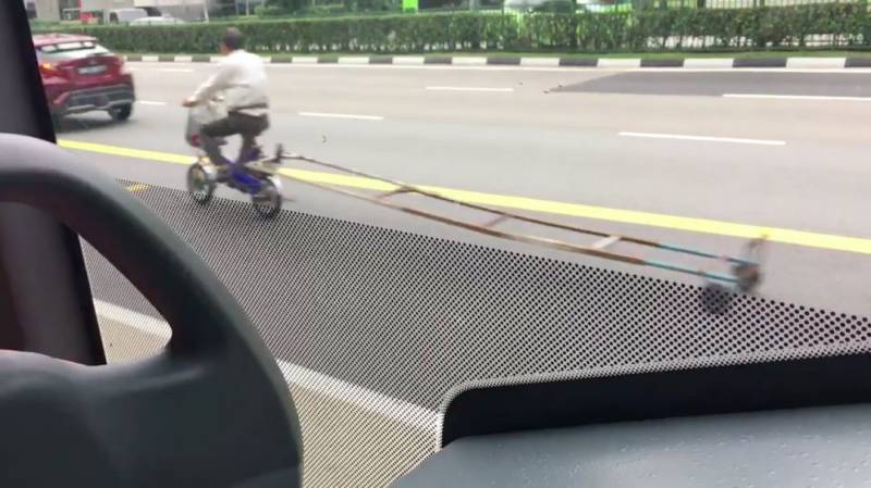 最近,一名网友Zedi Zack在公共巴士上看到疑似是同一名男子在马路上骑加长脚踏车。