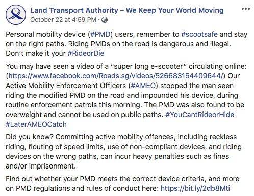 相信你已经听说过一名男子在新加坡马路上骑加长电动滑板车的事情了。