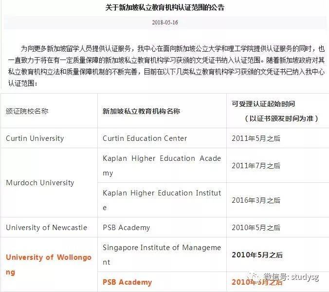 继纽卡斯尔大学之后,新加坡PSB学院与澳大利亚伍伦贡大学(University of Wollongong)合作课程文凭证书(颁发时间2010年5月之后)获得中国教育部认证。