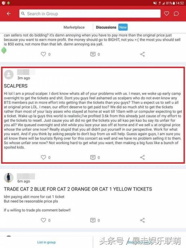 一位自称为黄牛党的卖家反弹,说当黄牛党也没有想像中的容易,他们也是七早八早起来或者是在售票处外过夜来买票,认为A.R.M.Y们不应该要求原价转让。