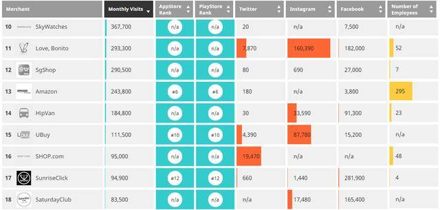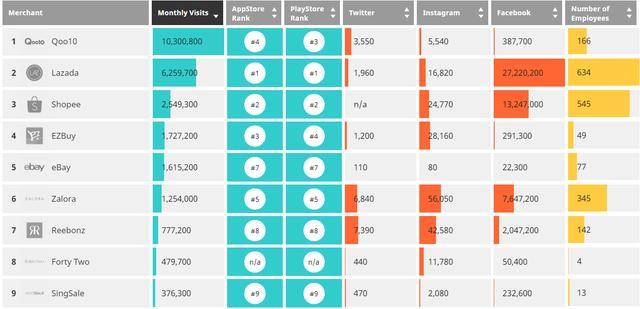 根据SimilarWeb的数据,新加坡的电子商务之王在流量方面是Qoo10,2018年第一季度,Qoo10在新加坡的月访问率达到了1347万次,其次是Lazada的1000万次。在上一季度,与Lazada的1,087万人相比,Qoo10的月访问量为1441万。然而,阿里巴巴旗下的电子商务网站在Apple App Store和Android Play Store中排名第一,而Qoo10在这两家笔记本中排名第三。