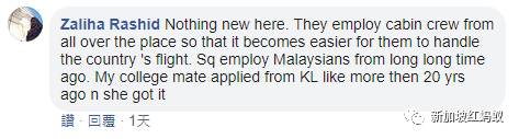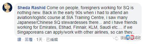 “大家,外国人为新航工作已经不是新鲜事了。早在90年代早期,我去参加一个航空/物流课程时,就在新航的训练中心看到许多日本和中国籍的新航空姐……而我也有朋友在阿联航空、阿提哈德航空、芬兰航空、荷兰皇家航空和沙特阿拉伯航空等航空公司工作……如果我们新加坡人可以去其他航空公司申请工作,他们当然也可以。”