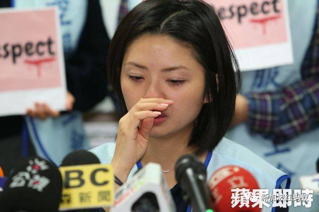 被乘客无礼要求协助如厕的长荣郭姓空姐在记者会上声泪俱下。(苹果日报)