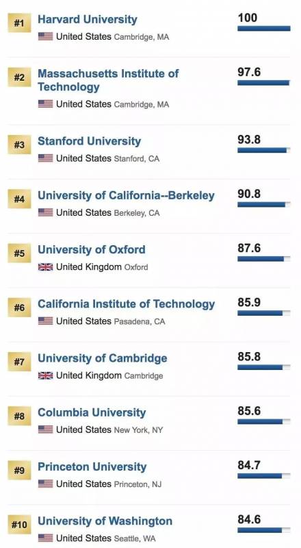 此次排名中,TOP10榜单院校并无变化。哈佛大学依然傲居首位,MIT(麻省理工学院)紧随其后,史丹福仍位列第三。