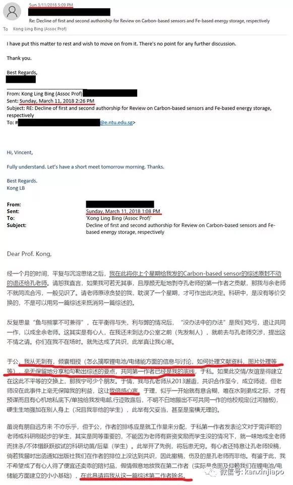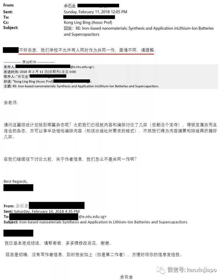 黄铭鸿说均为第一作者是之前以口头承诺达成的共识,没想到2月10号,余石金教授私发电邮说合写的综述把他列为第二作者,与最初答应的不同。