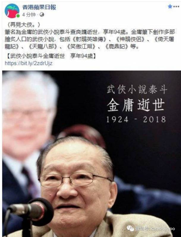 刚刚,香港媒体报道,金庸逝世,享年94岁。