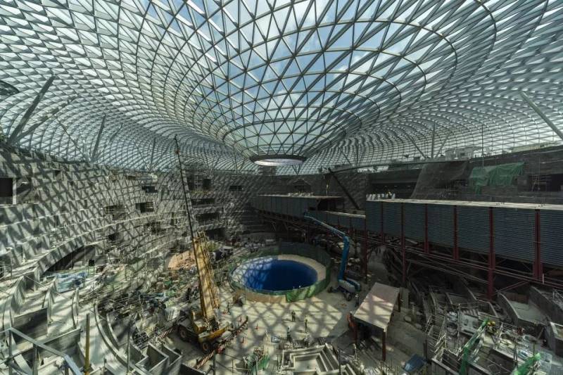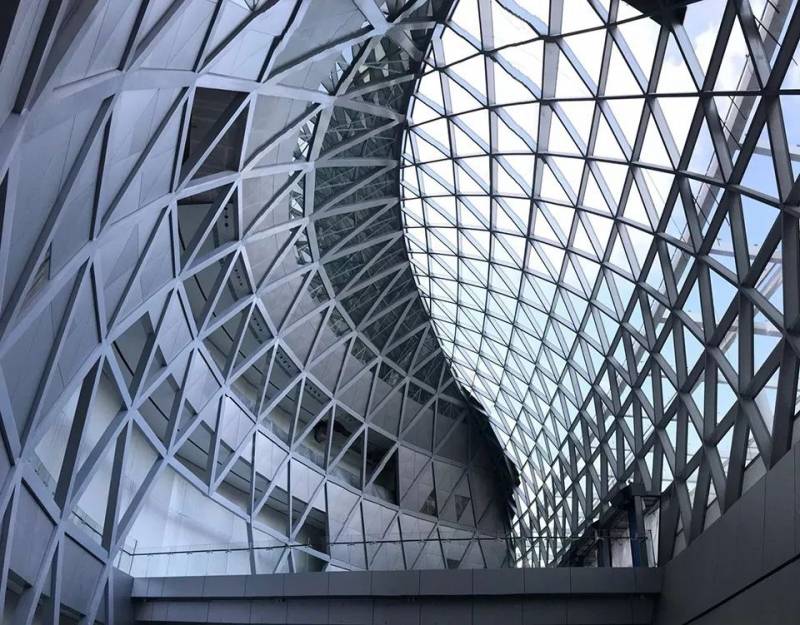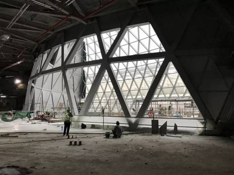 建筑的几何形态基于一个半倒置的圆形屋顶生成,最大跨度为200米。支撑结构间隔分布在花园边缘,一体化的结构和立面系统使几乎无柱的内部空间成为了可能。