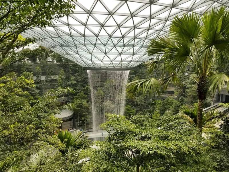 超过200种植物围绕着位于中央的“雨旋涡”(rain vortex)——这是全世界最高的室内瀑布(约七层楼高),从建筑拱顶上的圆洞一路倾泻至底部的森林谷花园。瀑布的流量最大可达到1万加仑/分钟,可以起到为景观环境降温的作用,从瀑布收集到的雨水还将在建筑中得到重新利用。