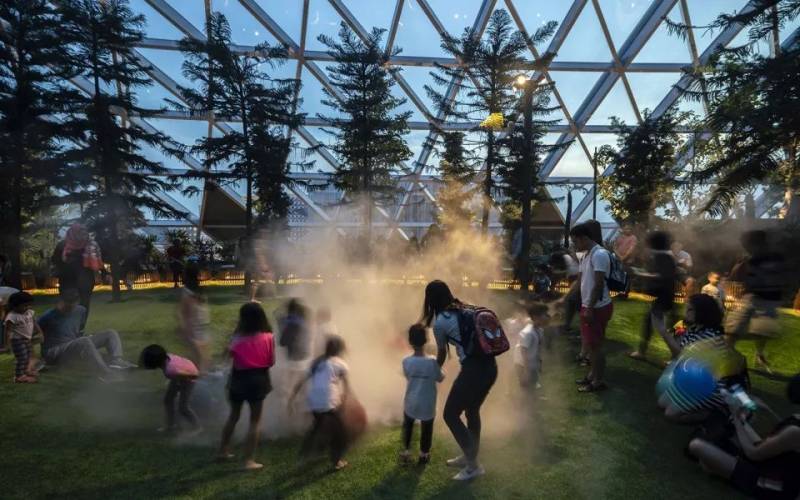 位于第五层的是“穹顶公园”(Canopy Park),包含14000平方米的、与花园空间相结合的休闲景观。网状的结构悬浮在树冠之间,玻璃悬桥、树篱迷宫和镜子迷宫共同营造出沉浸式的梦幻体验。
