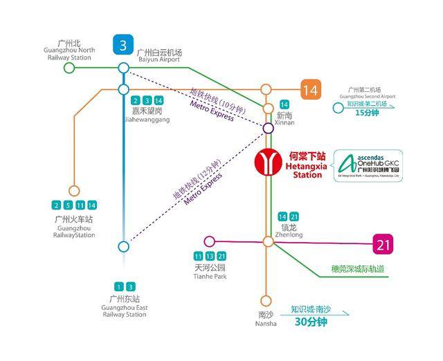 广州腾飞园是广州地铁14号线知识城支线上的何棠下站上盖项目,地铁知识城支线已开通运行, 14号线和21号线也将于今年年底开通,届时乘坐21号线快线只需25分钟即可到达天河区,与市中心无缝对接。与此同时,穗莞深城际轨道预计明年可实现通车,时速达160公里/小时,且在中新广州知识城设置了站点,连通白云机场、东莞、深圳,广州腾飞园融入粤港澳大湾区30分钟生活圈即将到来。知识城在交通配套方面已逐渐形成“五轨四高四快”的对外交通体系,未来还有三条高速地铁专线规划,完善的交通机制将推动物流、人流和资金流汇聚于此。