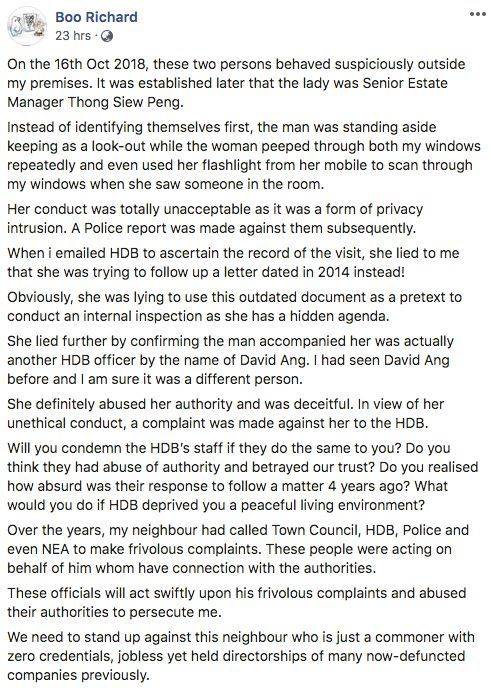 他也指出,他相信HDB官员到他家“调查”是因为邻居向镇议会、HDB、警方,甚至NEA投诉过自己。