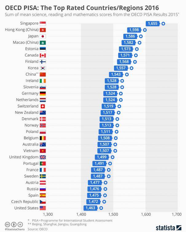 新加坡在2016年国际学生评估项目(PISA)的2小时考试中,三门核心科目的平均分数为1655分,成为考试的模范。前四名由亚太教育体系(Asia Pacific education systems)占主导地位,香港、日本和澳门表现出色。