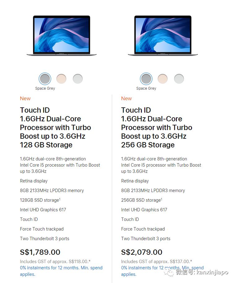全新MacBook Air目前仅有两个配置可选,这两个配置均为i5处理器,唯一不同的地方在于固态硬盘的容量分别为128GB和256GB,价格分别为S$1789和S$2079。