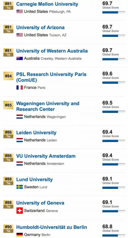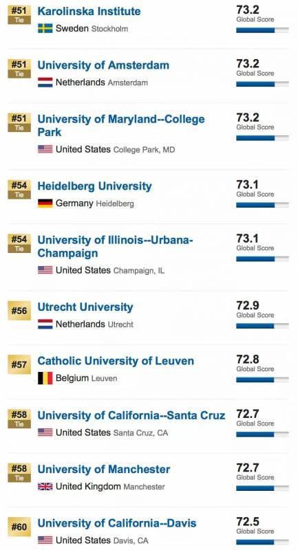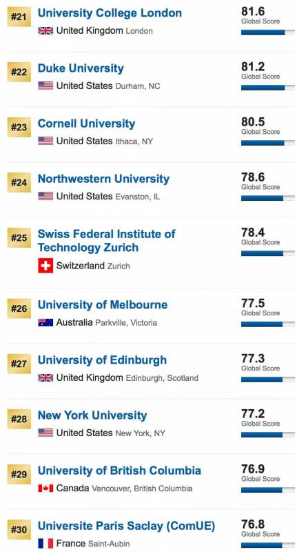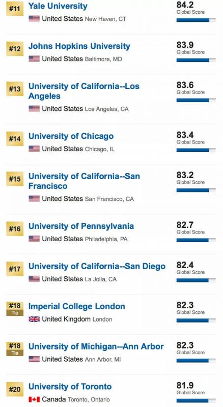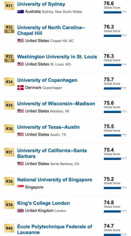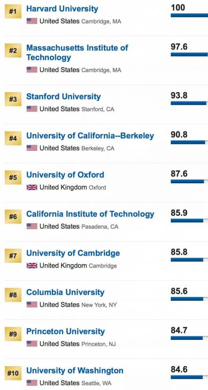 和去年的榜单一样,哈佛、MIT、史丹福依然位居冠亚季军,UCB和去年前年一样,也是保持排名全球第4的优势,牛津大学排在TOP5,加州理工第六名。