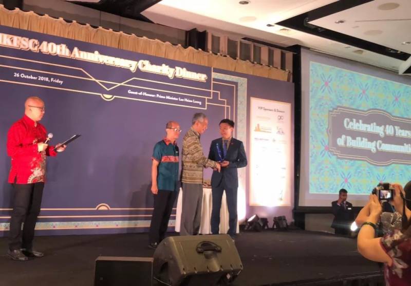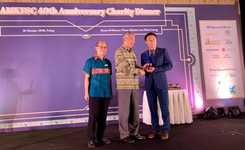在AMKFSC Community Services 40周年慈善晚宴(2018年10月26日星期五)上, 新加坡福智霖集团(SINGAPORE FOZL GROUP PTE.LTD)董事黄泽霖先生从新加坡李显龙总理手中接过感恩奖杯。这份认可与鼓励,让福智霖感动满满。