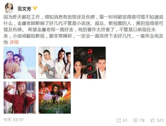 武侠小说泰斗金庸先生于2018年10月30日逝世,享年94岁。曾在新加坡版《神雕侠侣》《笑傲江湖》中出演“小龙女”和“任盈盈”的演员范文芳在微博po文表示悼念。
