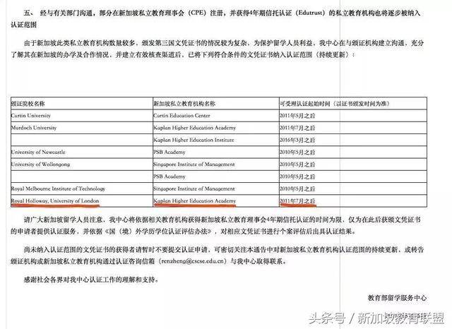 中国教育部留学服务中心表示,未来将与更多新加坡私立颁证机构建立沟通,充分了解其在新加坡的办学及合作情况,并建立有效核查渠道后,将符合条件的学校纳入认证体系。