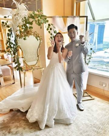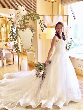汤薇恩透露,因嫌婚纱礼服太贵,只穿一次“不划算”,原先只打算穿订制旗袍现身婚宴,但后来很幸运获商家赞助结婚礼服还有手花,才当上白色新娘。