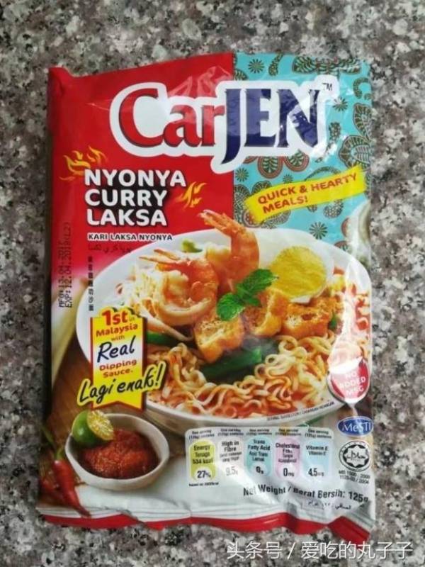 No.2 马来西亚嘉珍娘惹咖喱叻沙面外观(呈橙红色)面条(米白中粗螺旋状)口感(面条很劲道)味道(入口是淡淡的椰汁味,紧接着是复合的叻沙风味和淡淡的咖喱味,嘴里回味着浓浓的虾味,辣而不燥,甜而不腻,咸度适中)食材(虾米使汤更加香甜;香茅增加了一丝清香;蒜蓉和南姜提高了汤的辣度)调味包(叻沙酱包,虾酱包,椰子粉包)打分(91)