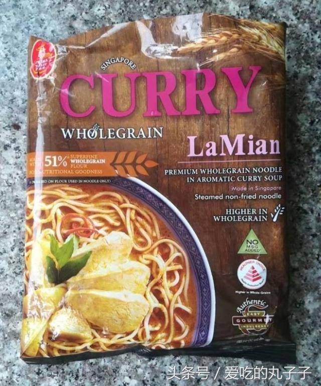 No.5 新加坡咖喱全麦拉面外观(呈黄褐色)面条(浅棕中粗圆柱状)口感(面条选用全麦粉和小麦粉,吃起来很紧实)味道(浓浓的椰子味伴随着微微的咖喱香味,美中不足的是椰子味过重,掩盖了咖喱的味道)食材(香茅和芫荽增加了一丝清香;虾酱丰富了汤的口感;黑胡椒粉和辣椒粉提高了汤的辣度;椰子粉使汤更加香甜)调味包(咖喱风味调味料包,椰子粉包)打分(88)