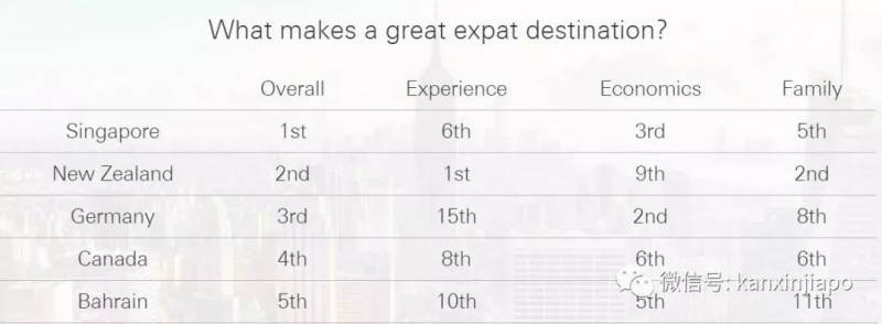 报告对来自世界各地共2,2318名外派人员进行追踪调查。主要衡量因素为:经济、生活体验和家庭,三个因素的平均分数便是国家/地区的综合得分。