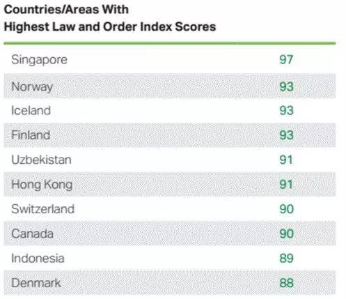 美国咨询公司盖洛普(Gallup)发布 2018 年《全球法律与秩序》报告,其中报告中有一项非常重要的排名数据——法律与秩序指数,指数越高,表示国家(地区)越安全。