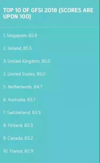 这个榜单由英国《经济学人智库》发布,根据世界卫生组织、联合国粮农组织、世界银行等权威机构的官方数据,综合评估113个国家的食品安全现状。在综合对比分析了各国的国家经济状态、人均收入、食物价格等因素。新加坡排名第1位,得分为94.3分。