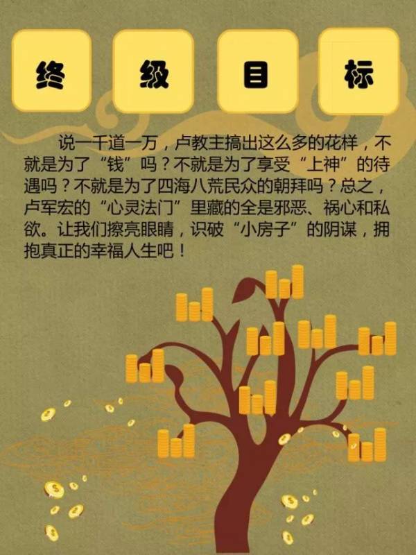 表面上是在让信徒们念经,实际是把“看图腾、讲灵性、谈玄解梦、烧小房子等”作为“心灵法门”的修学纲要灌输给信众,完全把信众导入贪求、愚痴的境地,最终达到敛财的目的。