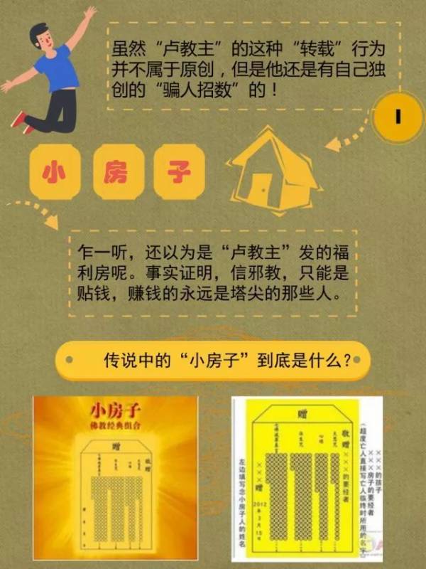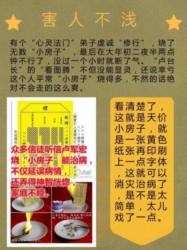 陈大妈说,她在一年前同老姐妹们在寺庙礼佛时,一个僧人向她们介绍了“心灵法门”,并告诉她们,“心灵法门”信仰的是观音菩萨,创始人卢军宏是观音菩萨的化身,在国外非常流行,可以祛病消灾,对孩子求学也有帮助。陈大妈等人信以为真,纷纷从僧人处购买了不少“心灵法门”的经文——“小房子”(印有小房子形状的黄色纸张),带回家焚烧,以求观音菩萨的保佑。