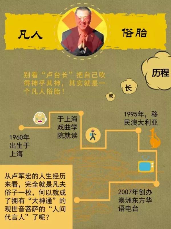 卢军宏,自称“卢台长”,男,1960年生于上海,曾在上海长宁沪剧团、静安越剧团的工作过。1989年出国到澳大利亚并加入澳籍。2007年6月,卢军宏在澳创办了东方华语广播电台,自任董事长兼台长。卢军宏利用他的电台,开办《玄艺问答》、《直话直说》、《白话佛法》、《玄艺综述》等栏目传播“心灵法门”。