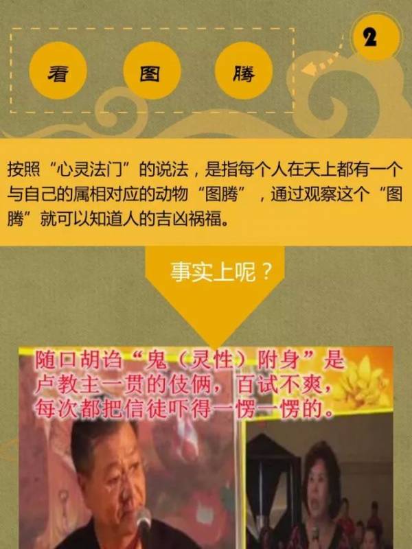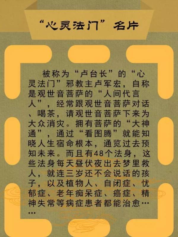 “心灵法门”神化头目卢军宏自称是“观世音菩萨”的代言人,拥有菩萨的“大神通”,通过“看图腾”,即能知晓人生宿命根本,通览过去预知未来。