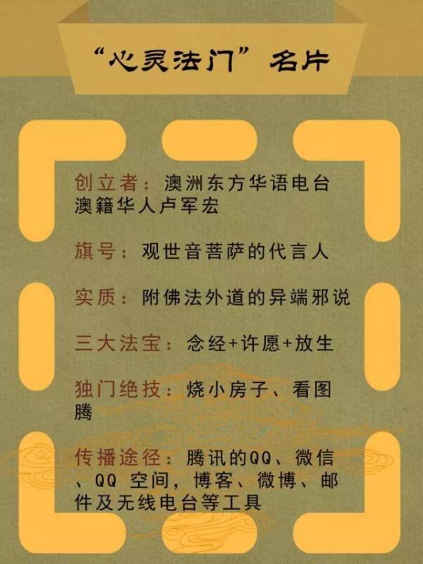 经了解,“心灵法门”,又名“卢台长心灵法门”、“观世音菩萨心灵法门”,是由澳籍华人卢军宏于2000年前后创立。